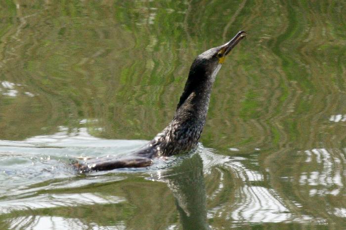 2008年 ウミウ 020 戻る 撮影(04/25) ウミウです。 顔の黄色い裸出部の三角形が鋭く尖って来たようにも感じます。いま、頸部に かなり大きな魚が入っています。 さて5月にも現れ、6月にも来るか、興味深いことです。 羽の色はまだ幼鳥ですが、少し黒くなったでしょうか? (Canon) EOS 40D EF 400mm F5.6L USM