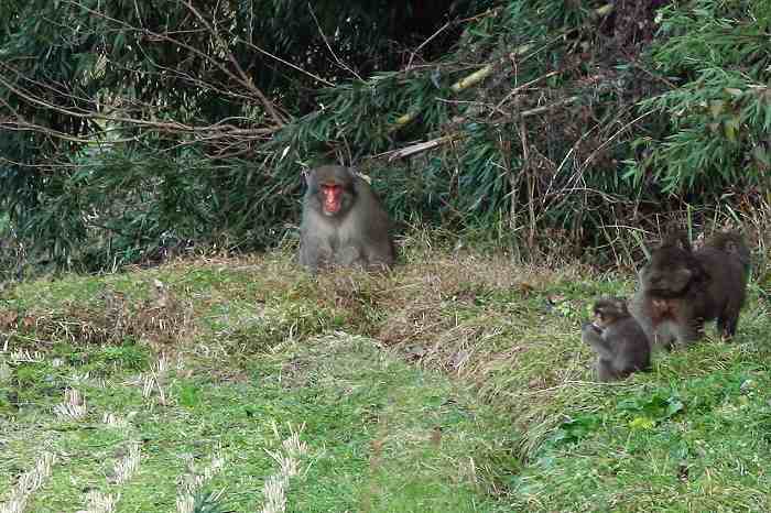 車道を猿(サル)が平常心で歩いていました。小さな集落で、路上に住人もいらっ