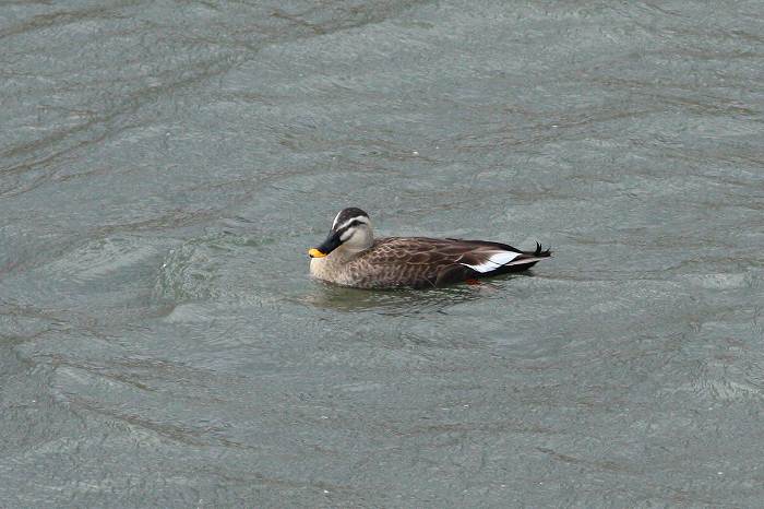 このカルガモは、単独で川を見回っているように思える個体です。何か気になる