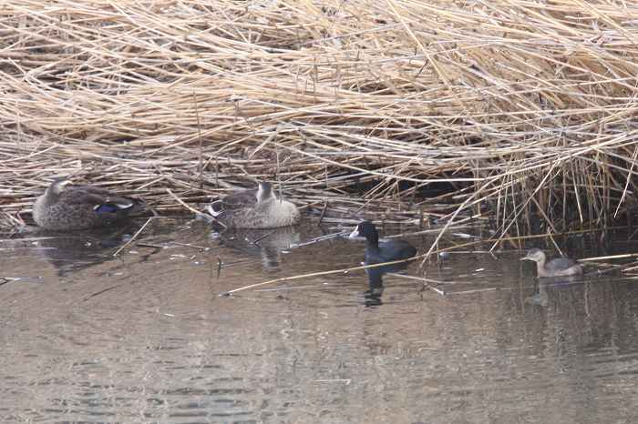 08日の光景です。この2羽のカルガモは、他の鳥に大人気です。オオバンと