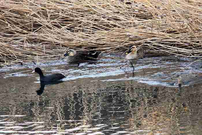 2009年 カルガモ 014 戻る 撮影(02/08) 大騒ぎの光景です。 オオバンがびっくりして写真左方向に逃げています。写真右上の葦近くの水中 で、カイツブリがぶつかって来たのだと思います。 当のカイツブリは「あれ?」というようなきょとんとした顔をしています。 カルガモは目覚めてしまいました。人気者も辛いようです。 (Canon) EOS 40D EF 300mm F4L IS USM+EXTENDER EF1.4X II