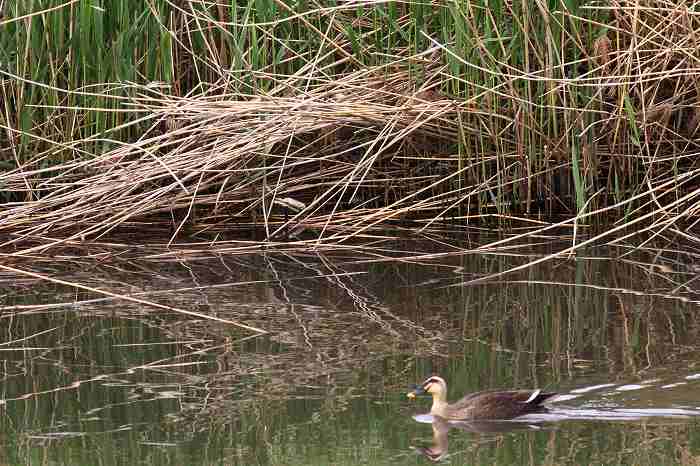 窓外の川を泳いでいるカルガモです。葦の新緑が始まり、渡り鳥が冬鳥から