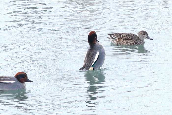 コガモは日本で見られるカモの中では最小です。全長は約38センチです。
