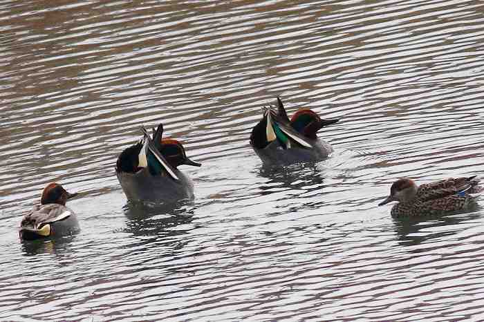 コガモ♂のディスプレイの多くは、先ず頸を空に向かって伸ばし、頭を高く上げ
