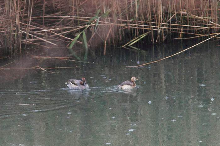 コガモもカイツブリも、カルガモの近くへ行って、しばらくの休憩しようと近づい