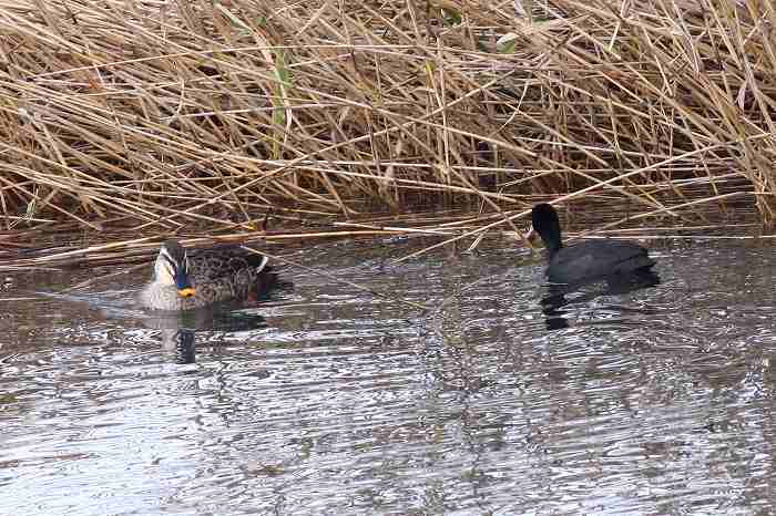 このオオバンはカルガモを見ると近寄っていきます。ところが、このカルガモは