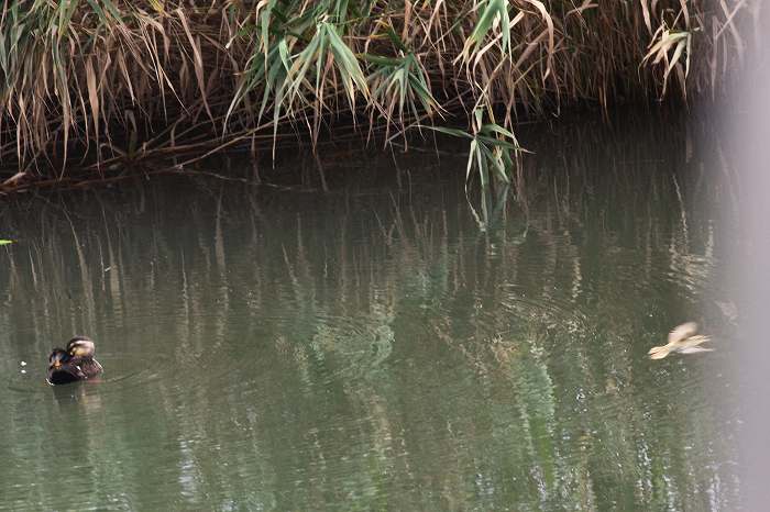 写真左のカルガモは、連日のように葦の近くを単独で泳いでいる不思議な個