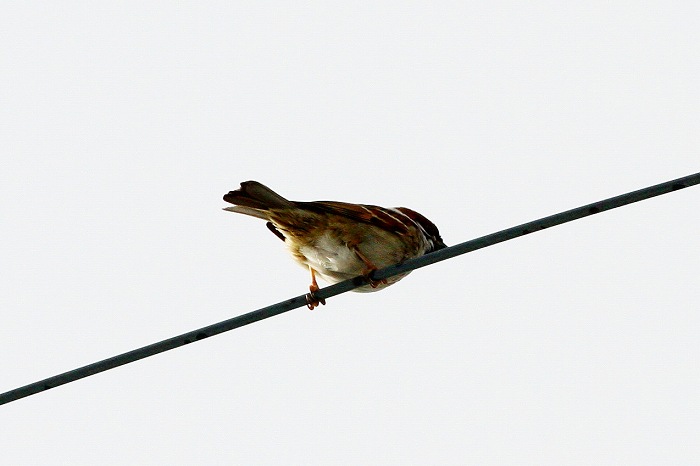 逆光時の露出失敗で、拙い写真ですがスズメです。耳羽あたりの黒い部分が濃いですから