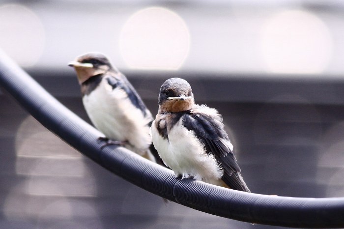 此の2羽はだれの子か。右側の1羽は、3月に飛来した変わったツバメの子だ