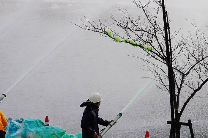 2009年 庭 004 戻る 撮影(01/11) 土手のサクラが、一時的に緑っぽい葉っぱを着けました。 当然ですが放水された色は人畜環境無害の素材が使用されていますから、 しばらくすると元の白い雪に戻りました。 (NIKON) D90 AF-S DX NIKKOR 16-85mm F3.5-5.6G ED VR