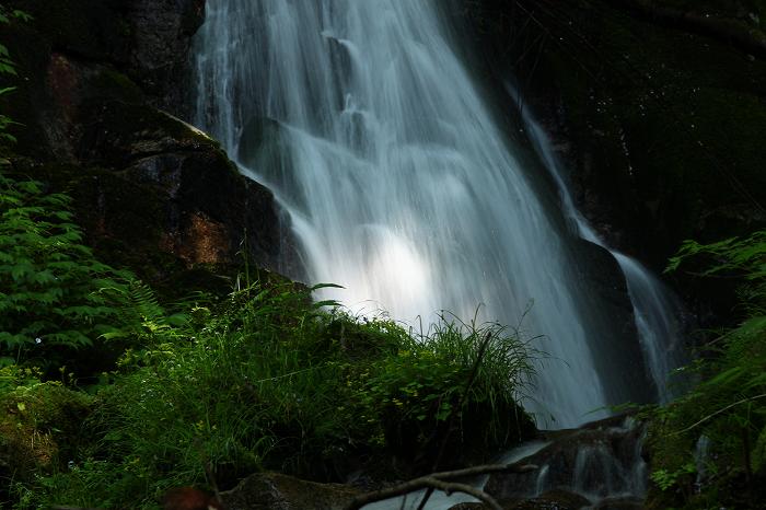 2009年 庭 060 戻る 撮影(05/26) 25日は友人の滝撮りに同行しました。高い山はまだ寒かったのですが、確実 に春が訪れていました。滝の近くに繁茂し始めた緑や、黄色や紫の小さな花が 綺麗でした。 岡山県津山市阿波の「廻り滝」(観音滝)です。 (Canon) EOS Kiss X3 EF 24-85mm F/3.5-4.5 USM
