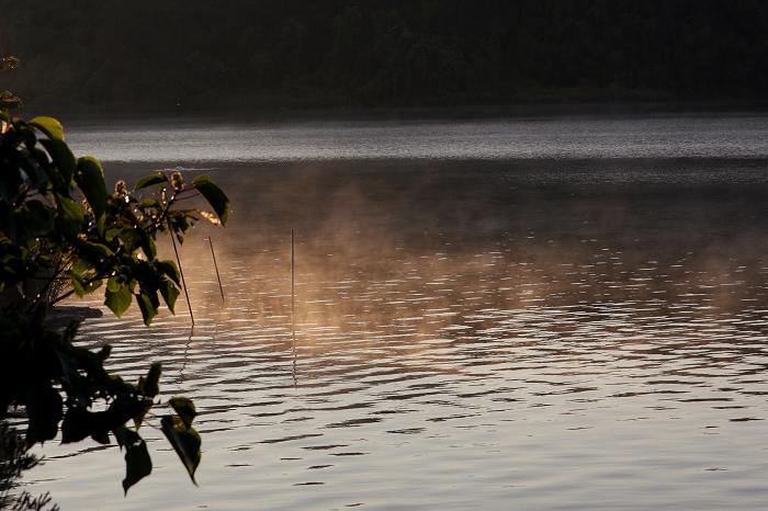 池の上を湯気がゆっくり流れていました。早朝は冷えるようになりました。