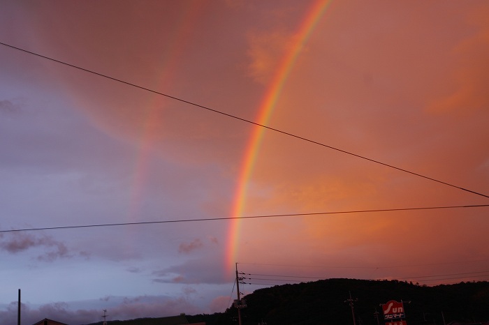2009年 庭 096 戻る 撮影(10/03) 2日早朝、豪快な虹が現れました。風があって、雲が動いていましたので、今 にも消えてしまいそうで、急いで撮りました。間もなく消えました。 結局、電話線などが、画面のど真ん中で見事なVサインを見せてくれました。 (Canon) EOS 50D EF-S17-55mm F2.8 IS USM