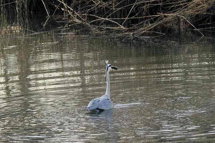 魚の捕獲に成功し、岸の方へ動いている光景です。