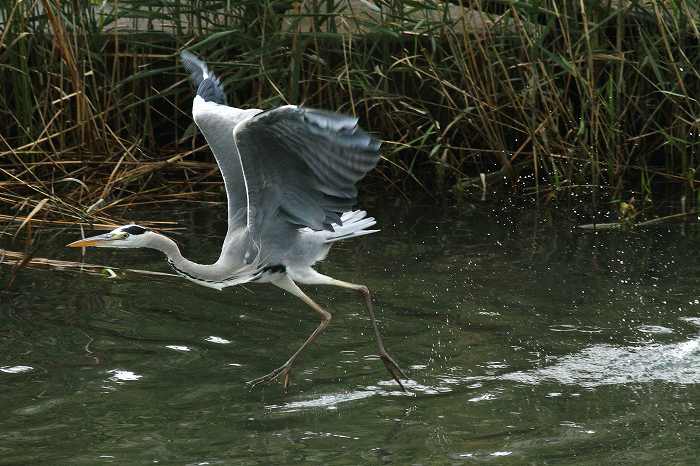 水面を走るようにして飛び立っています。川底に脚が届いていない時は、この