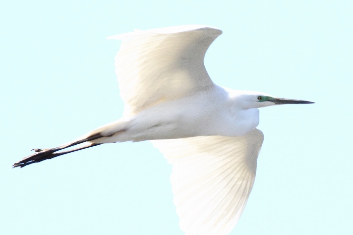 黒く長い足。長い嘴。目先が青緑色。口角が眼の後方を越えています。ダイサギで