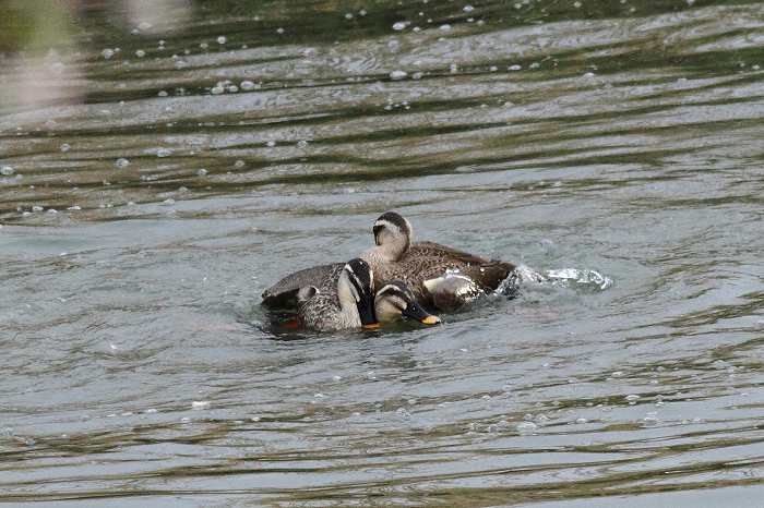 カルガモのペアに接近し過ぎたので、その1羽を怒った2羽が攻撃して