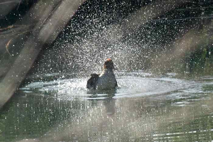 コガモの水浴びは、激しく猛スピードで翼を水面に叩きつけますので、水しぶきを