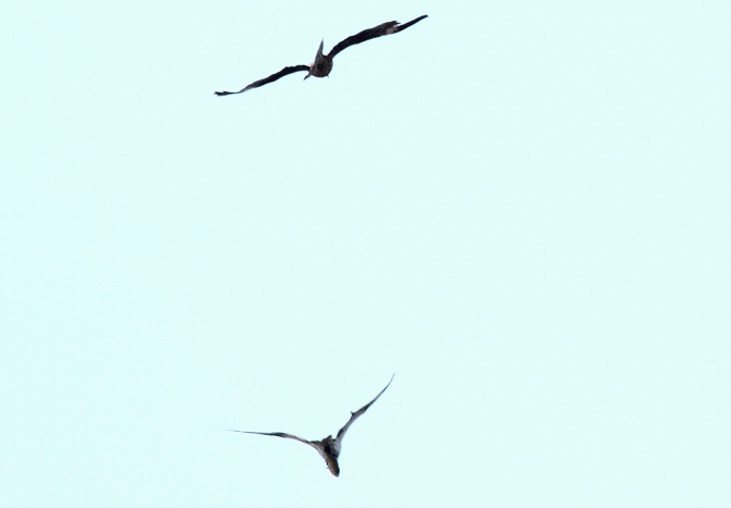 なんとも下手くそな写真です。写真上がトンビで、下が魚を持って飛んでい