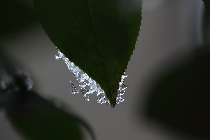 今にも葉から滑り落ちてしまいそうな雪が主役。