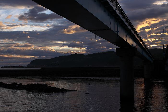 鳥取市青谷町の河口です。向こうに見える岬は、海女さんの存在で