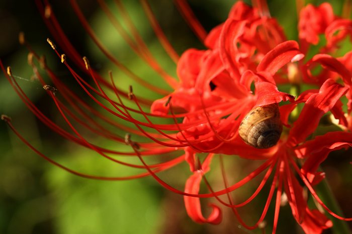 2010年 庭 164 戻る 撮影(10/02) 頻繁に訪れている近くの公園に数本の彼岸花が見られますが、ひょいと 見たら、でんでん虫がよじ登っていましたので、記念撮影をしました。 (Canon) EOS 50D EF100mm F2.8L Macro IS USM