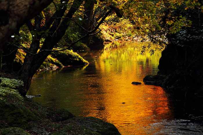 2010年 庭 235 戻る 撮影(11/11) 岡山県鏡野町「白賀渓谷」です。特に此の風景が好きで、過去にも同じ場所 の画を掲載したと思います。今回は紅葉が「見ごろ〜散り始め」でしたから、 燃える川になっていました。 (Canon) EOS 7D EF70-200mm F4L IS USM