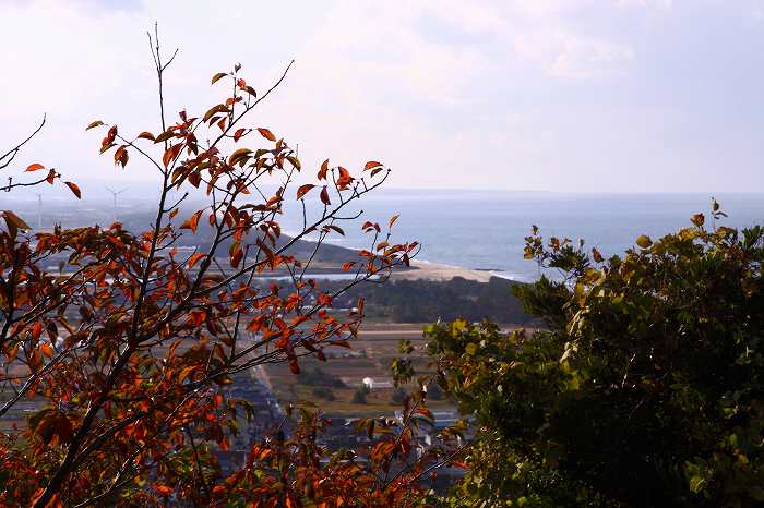 2010年 庭 261 戻る 撮影(11/19) 「馬ノ山公園」から、です。もう一枚載せました。サクラの葉っぱがかなり沢山 残っていました。 砂浜が弓状にカーブしています。向こうにうっすら見えるのは「弓浜半島」で す。その先端には境港市が在ります。「ゲゲゲの鬼太郎」で有名です。 (Canon) EOS 7D EF70-200mm F4L IS USM