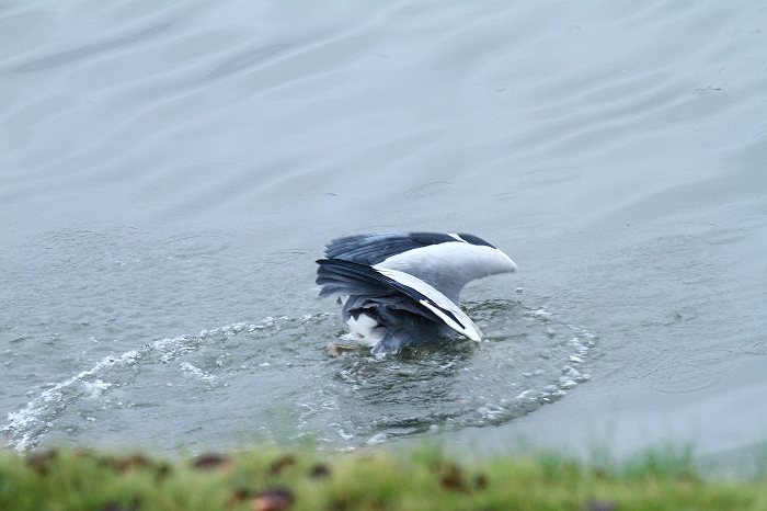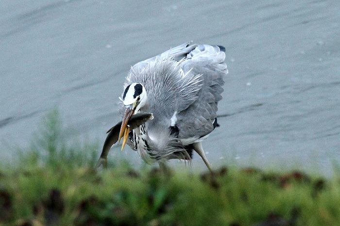 見事に魚を捕らえて岸に飛んで帰ってきました。よーく見ますと、魚をくわえているのでは