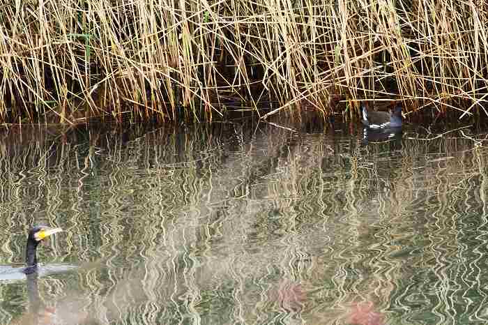 この辺りでカワウが忙しそうに魚を追っかけ回していましたが、突如として漁を止め、向こ