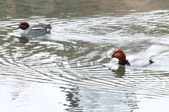 12日撮影です。その後姿を見ません。写真右側がホシハジロで、♂です。