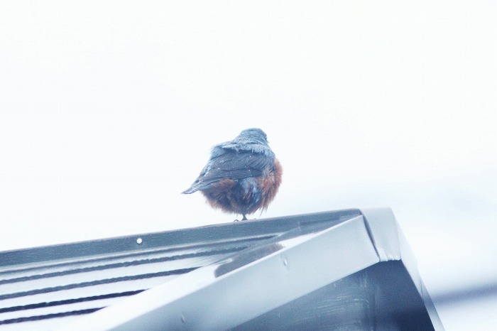 やはり右脚だけで立っています。汚れた窓ガラスに雨粒がくっついた状態で、室内