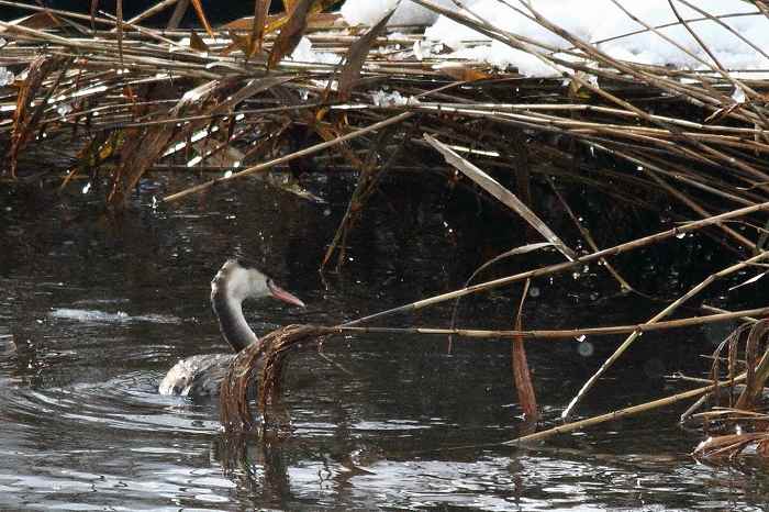 2011年 カンムリカイツブリ 003 戻る 撮影(12/25) 葦原の中に居る魚を狙っている姿です。カイツブリ類では最大のカイツブリですが、特に頸 が長いのが特徴です。体は大きいですが動作は非常に俊敏です。しかも水中で泳ぐ速度も 非常に速いように思います。短時間にかなり離れた場所に浮上します。水中で魚を追っか けているのでしょうか? 現在は単独です。 絶滅指標:危急種(環境省)。 (Canon) EOS 7D EF400mm F5.6L USM