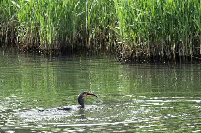 2011年 カワウ 007 戻る 撮影(05/04) アサ之丞と懇意な此のカワウ、今年も婚姻色に変身することもなく、相変わらず 単独で漁をしています。アサ之丞は何か多忙の様子で、深夜に大声を発しながら 何処かへ出張しています。 対岸の葦が美しい緑色になりました。こうなりますと、気に掛かる鳥といえば、 コヨシキリとコムクドリです。 (Canon) EOS 7D EF 400mm F5.6L USM