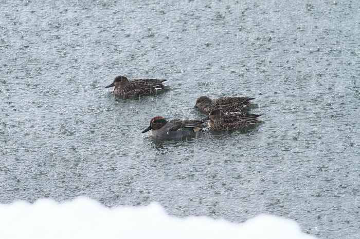 2011年 コガモ 001 目次 撮影(01/03) コガモは雪が降ろうが雨が降ろうが元気に泳ぎ回っています。相性の良い伴侶 探しで大騒ぎです。 空が急に晴れると、今度は水浴びや羽づくろいで大騒ぎです。 次に、異性に対して自分をアピールする時のスタイルをいくつかご紹介いたし ます。ディスプレイの時に見せる姿です。 (Canon) EOS 7D EF 400mm F5.6L USM