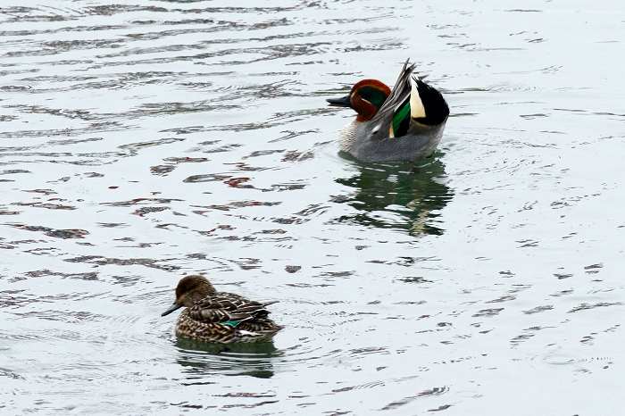 コガモの場合、♀が♂と同じスタイルを見せます。♂の集団が♀に向かっ