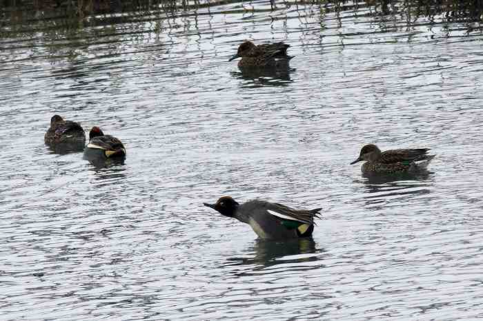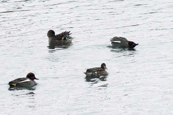 コガモのディスプレイ格好の一つです。体の上半身を思い切り前に突き出して、