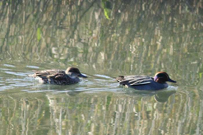2011年 コガモ 013 目次へ 撮影(12/14) 先ず昨日掲載のコガモ♂をご覧下さい。 此の写真は、14日番(つがい)で泳いでいた♂(写真右)の姿です。此の個体は体の横 に水平な白線がはっきり見られます。こういう姿になると「一人前」という感じがします。 来年1月頃には、多くの♂に此の白線が見られるようになるだろうと予想します。但し成 長が遅い個体も居ます。 (Canon) EOS 7D EF 400mm F5.6L USM