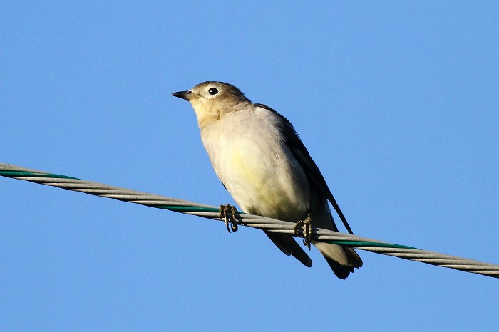 2011年 コムクドリ 002 戻る 撮影(09/08) 08日以降は姿を見ません。再び渡来するまでは再会出来ないと思いますので、 同日撮った写真を載せておきます。 ♀か幼鳥だと思います。全体に淡く白っぽいですが、晴天の写真ですから、断定 出来ないと思います。嘴がはっきりした黒色ですから、成鳥♀、の可能性の方が強 いと思います。 (Canon) EOS 7D EF400mm f/5.6L USM