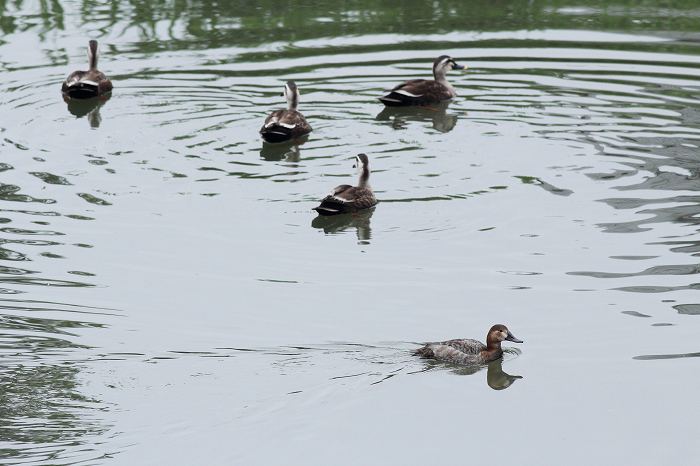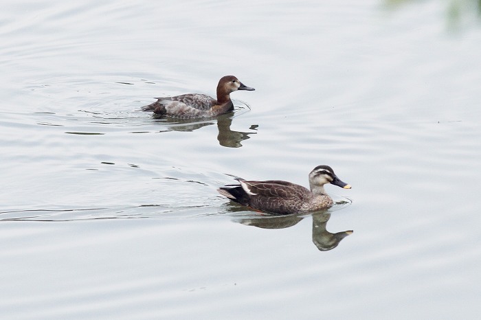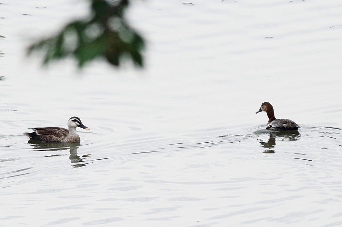 仲良しでないカルガモはあちらの方を見ています。当然ですが、近くをオオホシハジロ