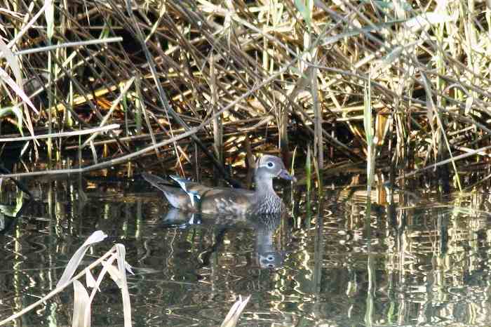 ました。それを見たオシドリ♀は葦原の方へ行って隠れました。
