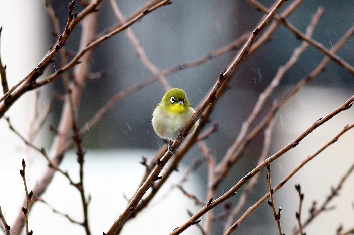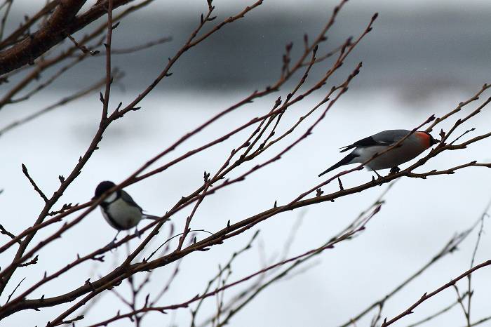 先ずウソが来て、次にシジュウカラが来て、次にメジロが来て、一緒に同じ木で