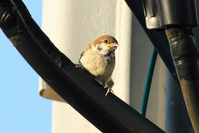 2011年 スズメ 008 戻る 撮影(07/11) 幼鳥が現れました。見るからに童顔です。嘴の基部は淡黄色ですが、光線の関係で 白っぽく写っています。耳羽の黒斑が小さいのも幼鳥の特徴です。 (Canon) EOS 7D EF400mm F5.6L USM