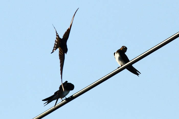 現在、コシアカツバメはツバメと一緒に飛んだり、並んで電線に止まったりしています