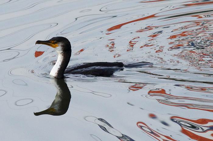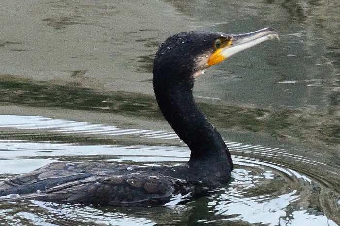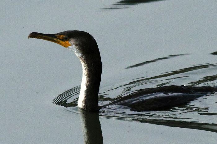 此のウミウは幼鳥です。私の推測では、オオホシハジロと一緒に川に入って来たの