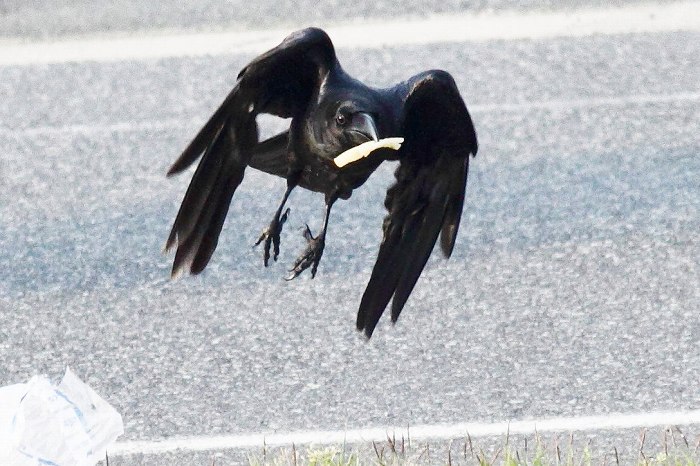 2012年 ハシブトガラス 004 戻る 撮影(05/08) こちらの道路上に設置されているゴミ箱からビニール袋をくわえて、向こうの 道路まで運び、そこで袋の中から何かを取り出し、それをくわえて飛び立った姿 です。 こちらのゴミ箱にはカラス害を見張る人が来ることを知っての行動です。 ま、困った鳥です。 (Canon) EOS 7D EF400mm F5.6L USM