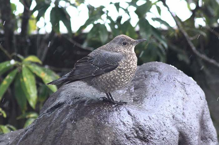 我が家の庭石にとまって餌がありそうな場所を探しているイソヒヨドリ♀です。