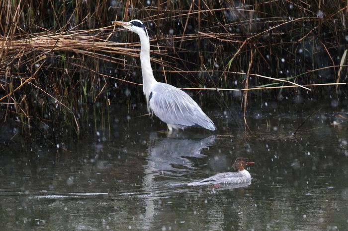 アオサギ(Ardea cinerea)の前を通過する時に見せた姿です。頭の羽を前から