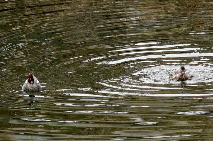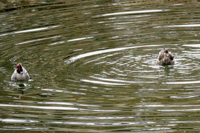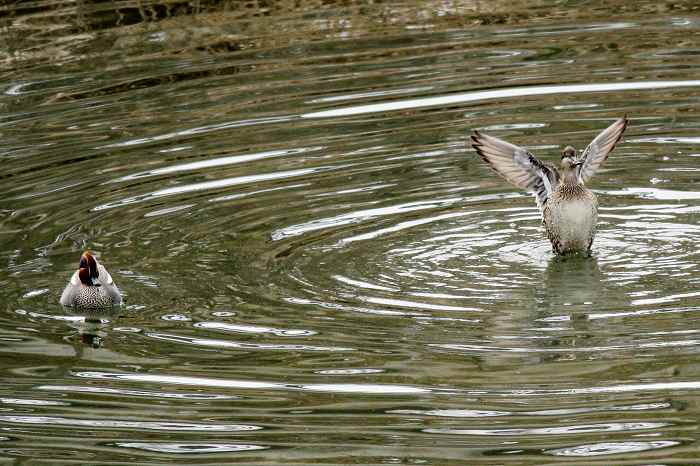 交尾が終わり、♂が少し離れて♀を見守っている光景です。コガモの交尾を見