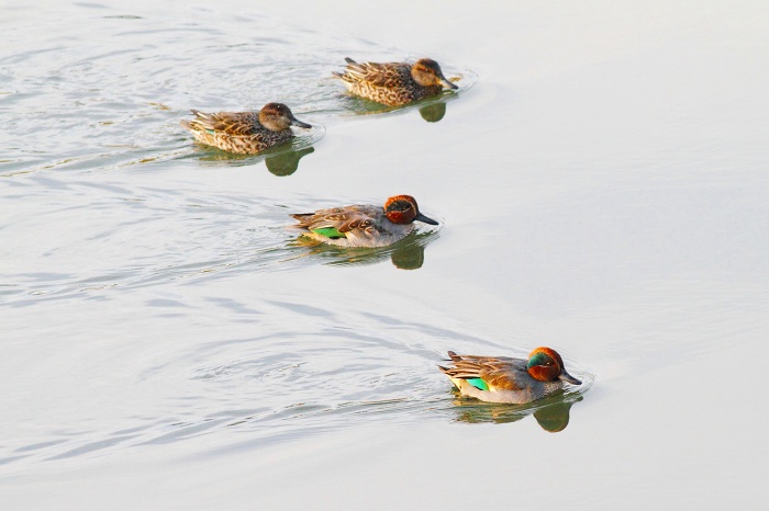 渡り鳥で冬鳥です。日本で見られるカモ類の中では最小の水辺の鳥です。